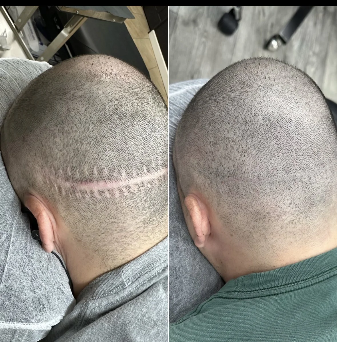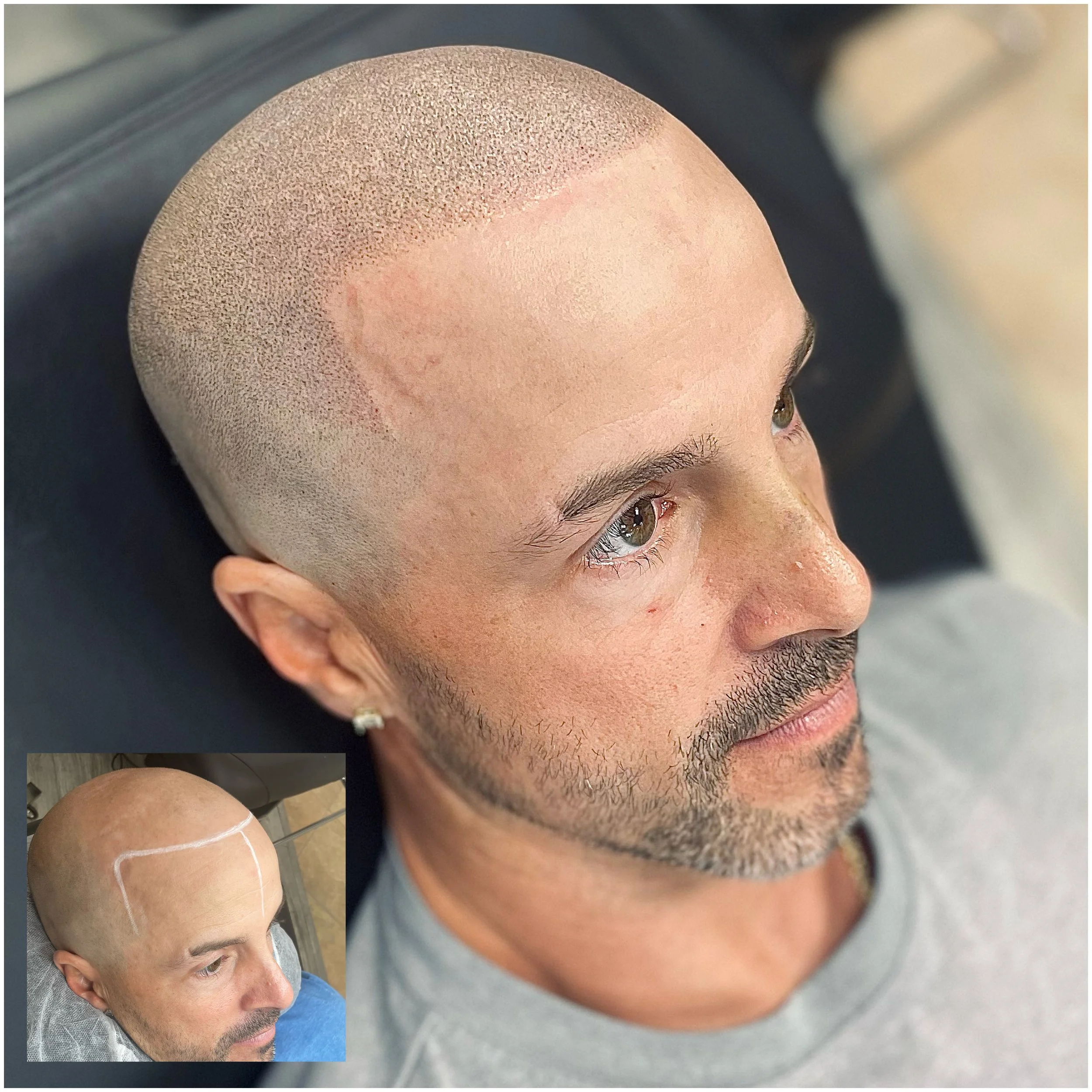 Absolutely! We use our specialized scalp micropigmentation technique to deposit color matched pigment into the scar to reduce visibility. We specialize in covering up FUE/FUT and other scars on your scalp.
